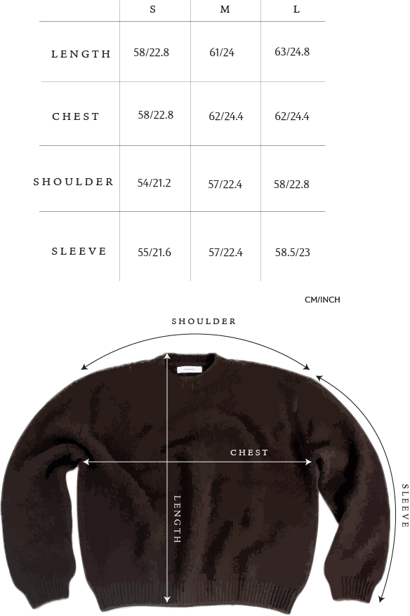 Utilising minimally processed **yak wool**, our Archer crewnecks are knitted on rare 5-gauge machines with a carefully lowered tension. This method creates pieces that are light and airy on the body, yet retain the presence and warmth of a more substantial knit.